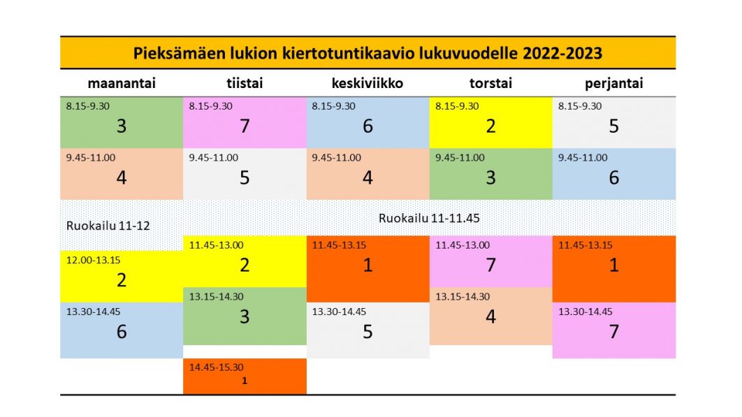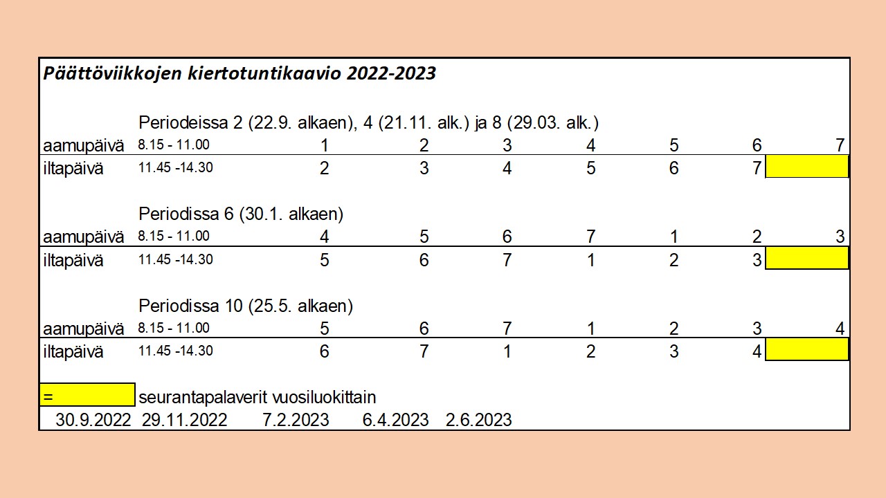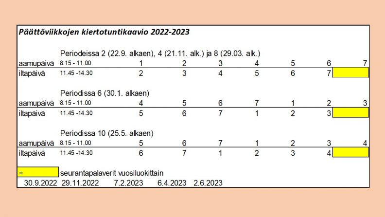 Kunkin palkin oppitunnit sijoittuvat viikon lukujärjestykseen ns. kiertotuntikaavion mukaisesti. Oheisena on myös taulukko päättöviikkojen kiertotuntikaaviosta. Palkkien paikat kiertotuntikaaviossa ovat pääsääntöisesti samat joka jaksolla. Kiertotuntikaavioon voi kuitenkin tulla muutoksia eri periodeille, mikäli opetusjärjestelyt niin edellyttävät. Muutokset näkyvät reaaliaikaisesti Wilmassa olevassa opiskelijan työjärjestyksessä. Wilmasta näkyy päivän työjärjestykset, arviointiviikon aikataulut, kurssiarvosanat jne.