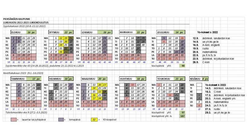 Lukuvuoden työ- ja loma-ajat sekä arviointiviikot ja ylioppilastutkinnon koepäivät on merkitty oheiseen työpäivätaulukkoon.