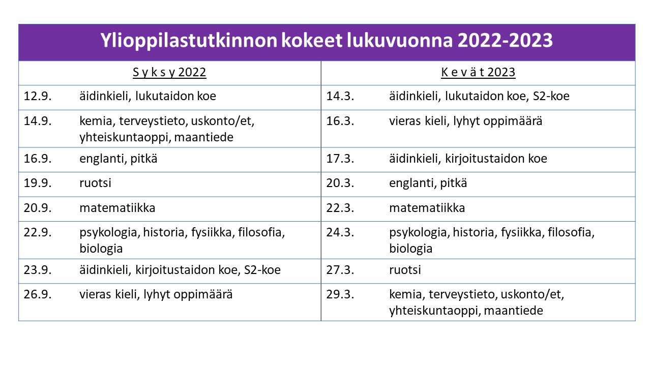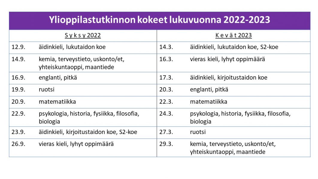 Lukuvuoden 2022-2023 ylioppilastutkinnon koepäivät ja aikataulut