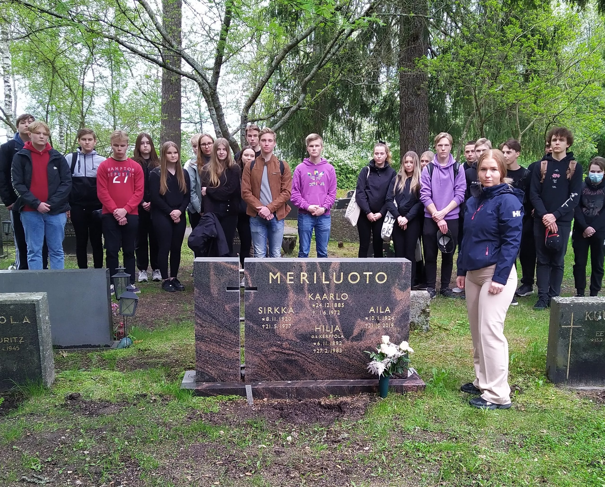 Kirjailija Aila Meriluodon haudalle teimme kulttuurikävelyn 25.5.2021 äidinkielen tunnilla. Ryhmä ÄI03.2 on historian ensimmäinen, joka on vieraillut klassikkorunoilijan leposijalla Hiekkapuron hautausmaalla. Hautakiven on suunnitellut arkkitehti Petri Viita. (Kuva: M. Tyrväinen)