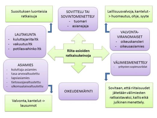 Riita-asioita, kuten vaikkapa maa-alueen omistuskiistaa tai kuluttajan erimielisyyksiä myyjän kanssa, voidaan ratkoa myös ilman oikeudenkäyntiä. OIkeudenkäynti voi olla kallis ratkaisu, sillä pääsääntöisesti hävinnyt osapuoli maksaa vastapuolen oikeudenkäyntikulut. Riita-asia voidaankin ratkaista myös kaikkien osapuolten hyväksymässä sovittelumenettelyssä missä pyritään löytämään sovintoratkaisu oikeudenkäynnin sijaan. Sopimukseen pääsemisen helpottamiseksi on myös luotu erilaisia elimiä käsittelemään riita-asioita: kuluttajariitalautakunta, potilasvahinkolautakunta. Lisäksi on asiamiehiä, kuten tietosuojavaltuutettu, tasa-arvovaltuutettu ja lapsiasiavaltuutettu, joiden tehtävänä on mm. esittää suosituksia oikeasta ja kohtuullisesta menettelystä.