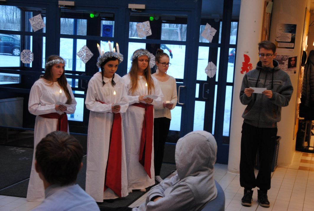 Lukion Lucia-neidot – kaikki ’ykkösiä’ – Taika Määttänen, Jenna Kantola, Anu Karppinen ja Siiri Lemettinen toivat valon tervehdyksen lukion aulaan tiistaiaamuna 13.12.2016. Niko Kohvakka huolehti legendan luvusta.