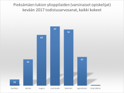 Kevään 2017 ylioppilaiden määrä on 68, joten yhteensä ylioppilaita lukuvuoden aikana valmistui 72. Koulumme 107 vuoden historian aikana ylioppilaita on valmistunut yhteensä 7388.
