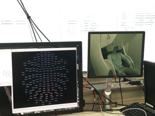 Juho Putkonen toimi koehenkilönä MEG-laitteessa. Etualan näytöllä Juhon aivomagneettikenttää.
