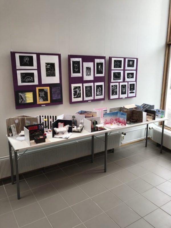 KU2 kurssilla tehtyjä tilatöitä ja KU1 kurssilla tehtyä grafiikkaa Poleenin näyttelyssä.