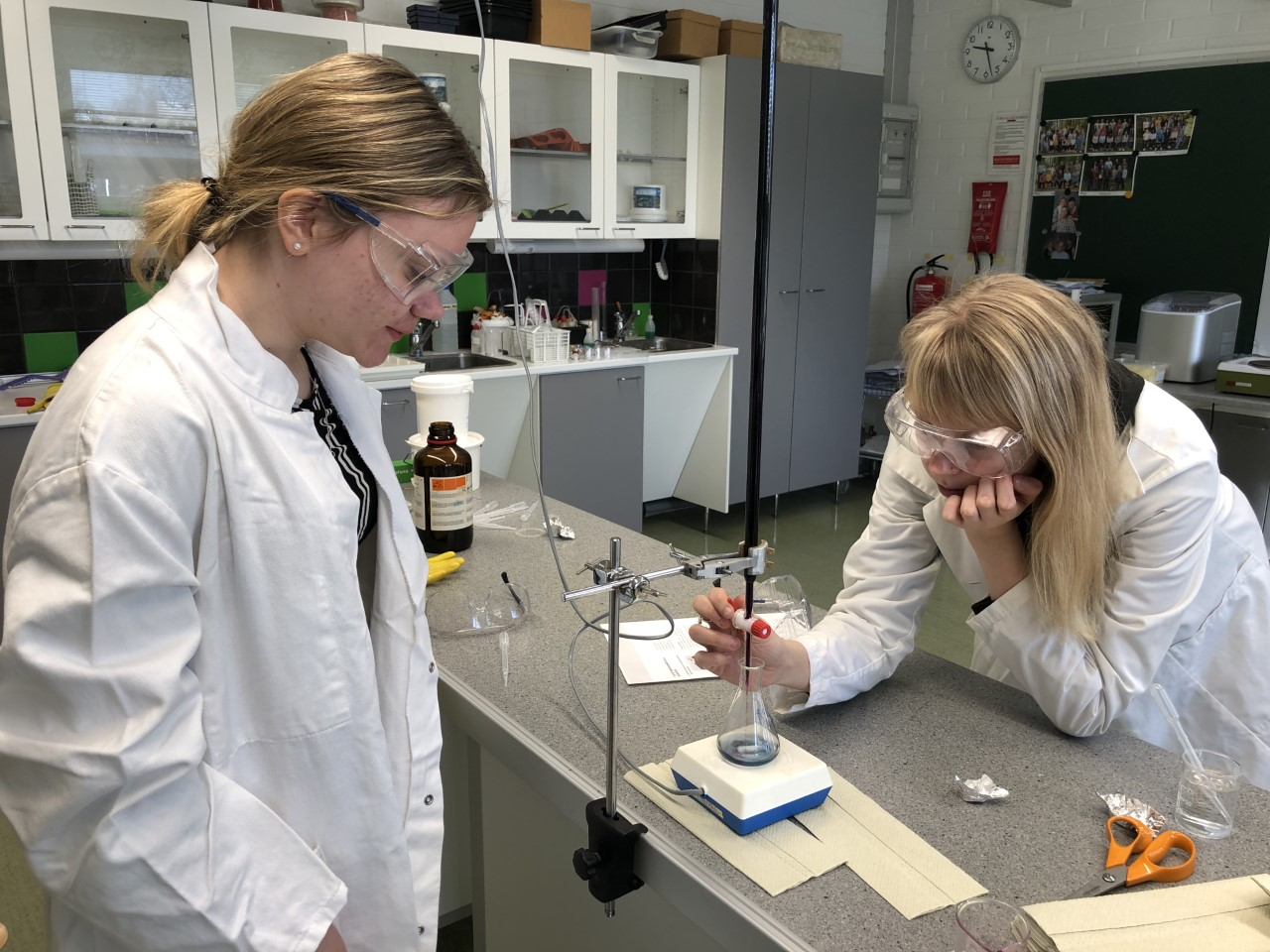 Salla Markkanen ja Veera Antikainen tutkivat partakoneen terän rautapitoisuutta teemaviikolla.
