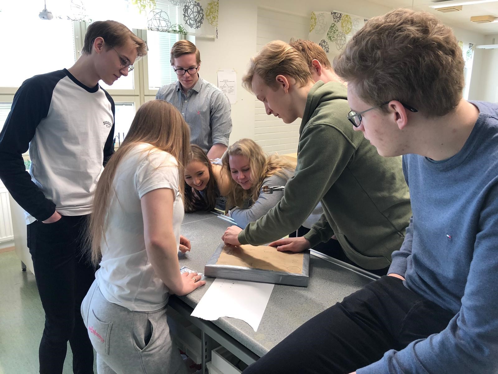 Projektiviikon kansainvälisyysryhmä työskentelee kuvisluokassa.
