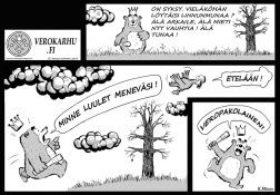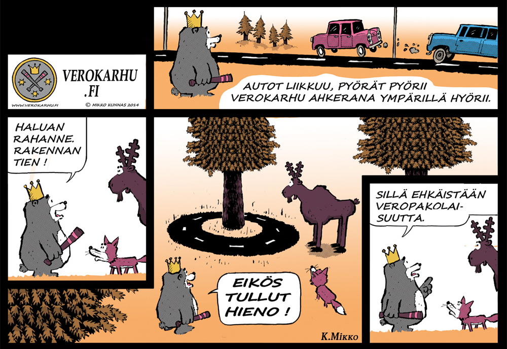 Mitä palveluja yhteiskunta tuottaa verovaroilla? Millaisia ajatuksia verotuksesta oheinen sarjakuva sinussa herättää?