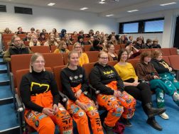 TE-toimiston ammatinvalintapsykologi Malla Laamanen pohtimassa tulevaisuuden taitoja ja suuntia yhdessä lukiolaisten kanssa.
