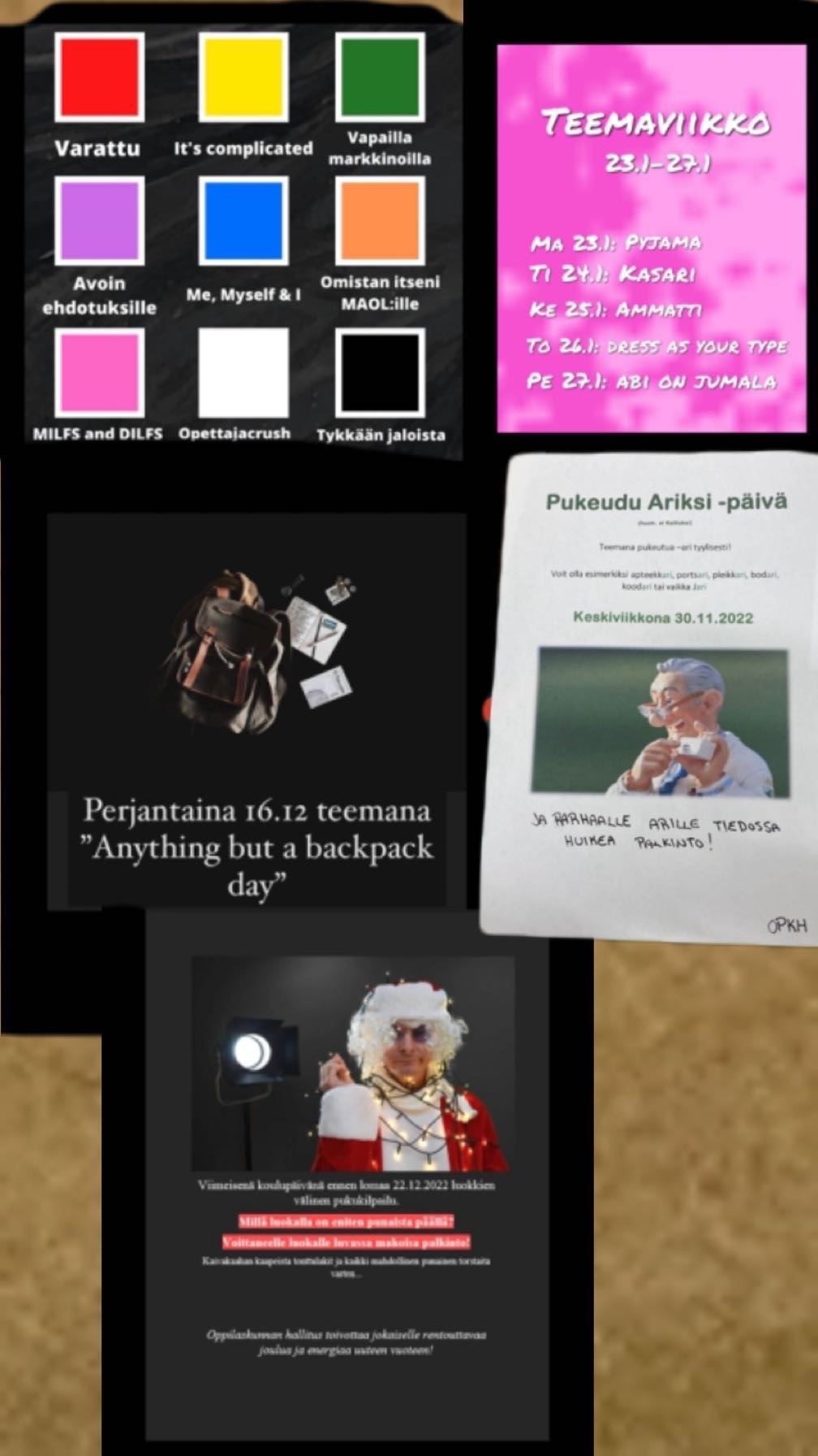 Hallitus järjesti lukuvuoden aikana 6 teemapäivää + abien teemaviikosta abeille ilmoituksen sekä yhteisen joulujuhlan. Mukaan mahtui myös yksi Esedun kanssa yhteinen vappujuhla. Hallitus päivitti aktiivisesti someaan ja kyseli siellä opiskelijoilta, mitä he toivoisivat kouluun järjestettäväksi. Hallitus pyrki järjestämään myös lanit, mutta idea siirtyi ensi lukuvuoteen. Hallitus haki myös rahoitusta ja osti rahalla lukusaliin vilttejä, tyynyjä, palapelejä, lautapelejä ja pöytäilmakiekon. Samalla ostettiin myös herkkuja, joita jaettiin palkinnoksi ennen joululomalle lähtöä joulujuhlassa. Kauppareissusta pidimme livelähetyksen Instagramiin, jossa opiskelijat pystyivät reaaliaikaisesti toivomaan, että mitä ostaisimme. Joulujuhlassa paikalla oli joulupukki , joka jakoi jokaiselle luokalle suklaata ja hyvää mieltä. Samainen pukki oli myös bingoisäntänä.