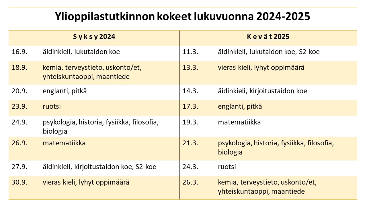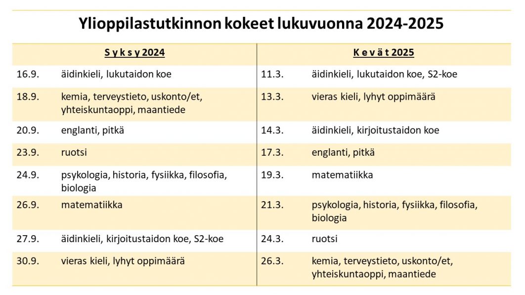 Lukuvuoden 2024-2025 ylioppilastutkinnon koepäivät ja aikataulut