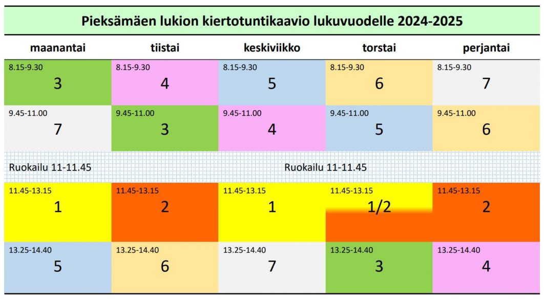 Kunkin palkin oppitunnit sijoittuvat viikon lukujärjestykseen ns. kiertotuntikaavion mukaisesti. Palkkien paikat kiertotuntikaaviossa ovat pääsääntöisesti samat joka periodissa. Kiertotuntikaavioon voi kuitenkin tulla muutoksia eri periodeille, mikäli opetusjärjestelyt niin edellyttävät. Muutokset näkyvät reaaliaikaisesti Wilmassa olevassa opiskelijan työjärjestyksessä. Wilmasta näkyy päivän työjärjestykset, päättöviikon aikataulut, kurssiarvosanat jne.