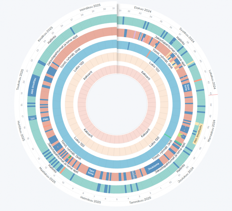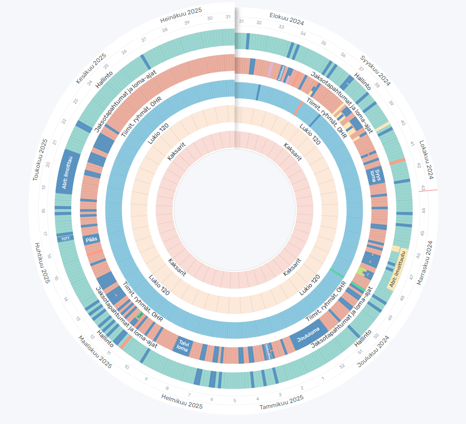 Plandiscin sähköisen kalenterin renkaat mahdollistavat kaikkien lukuvuoden tapahtumien kokoamisen yhden vuosikellon kehien kokonaisuudeksi. Voidaan muotoilla kohdennettuja versioita tarvittaessa: jaksotapahtumat, ohjaus, tiimit, opiskelijakunnan asiat tai kaksoistutkintolaisten aikataulut.