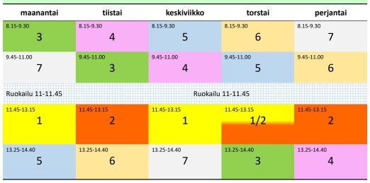 Kiertotuntikaavio minkä mukaan oppitunnit sijoittuvat työjärjestykseen.