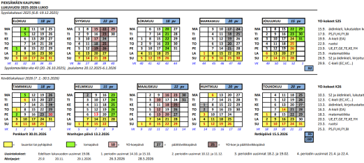 Lukuvuoden työ- ja loma-ajat sekä päättöviikot, uusintakokeet, rästipajat ja ylioppilastutkinnon koepäivät on merkitty oheiseen työpäivätaulukkoon.
